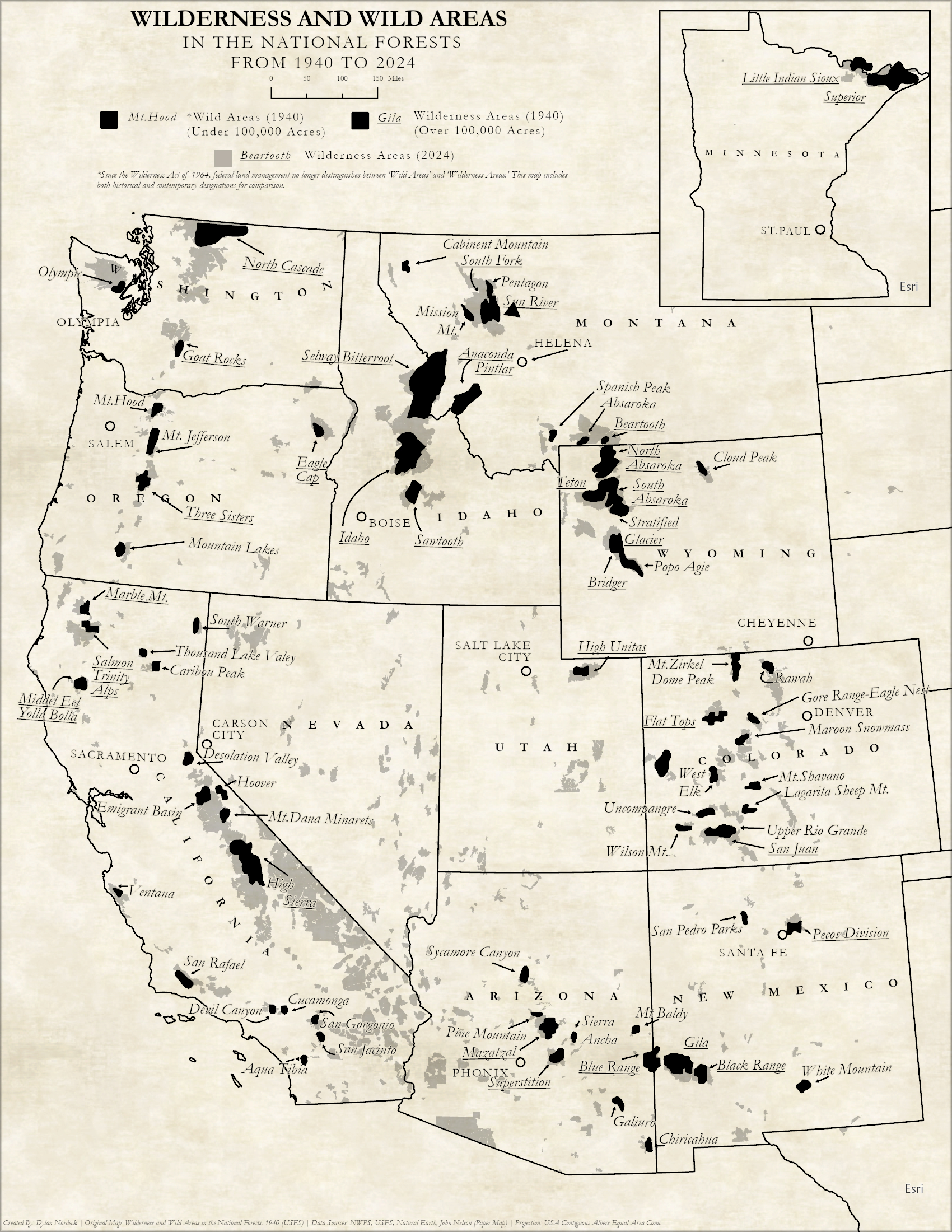 A digital reinterpretation of a 1940s wilderness map, created through manual digitization of original boundaries and labels. The project focuses on preserving the visual language of the source material while adapting it for modern digital display.Design decisions emphasized typographic clarity, restrained color, and subtle texture to reflect the original printed map without overwhelming the underlying geography.