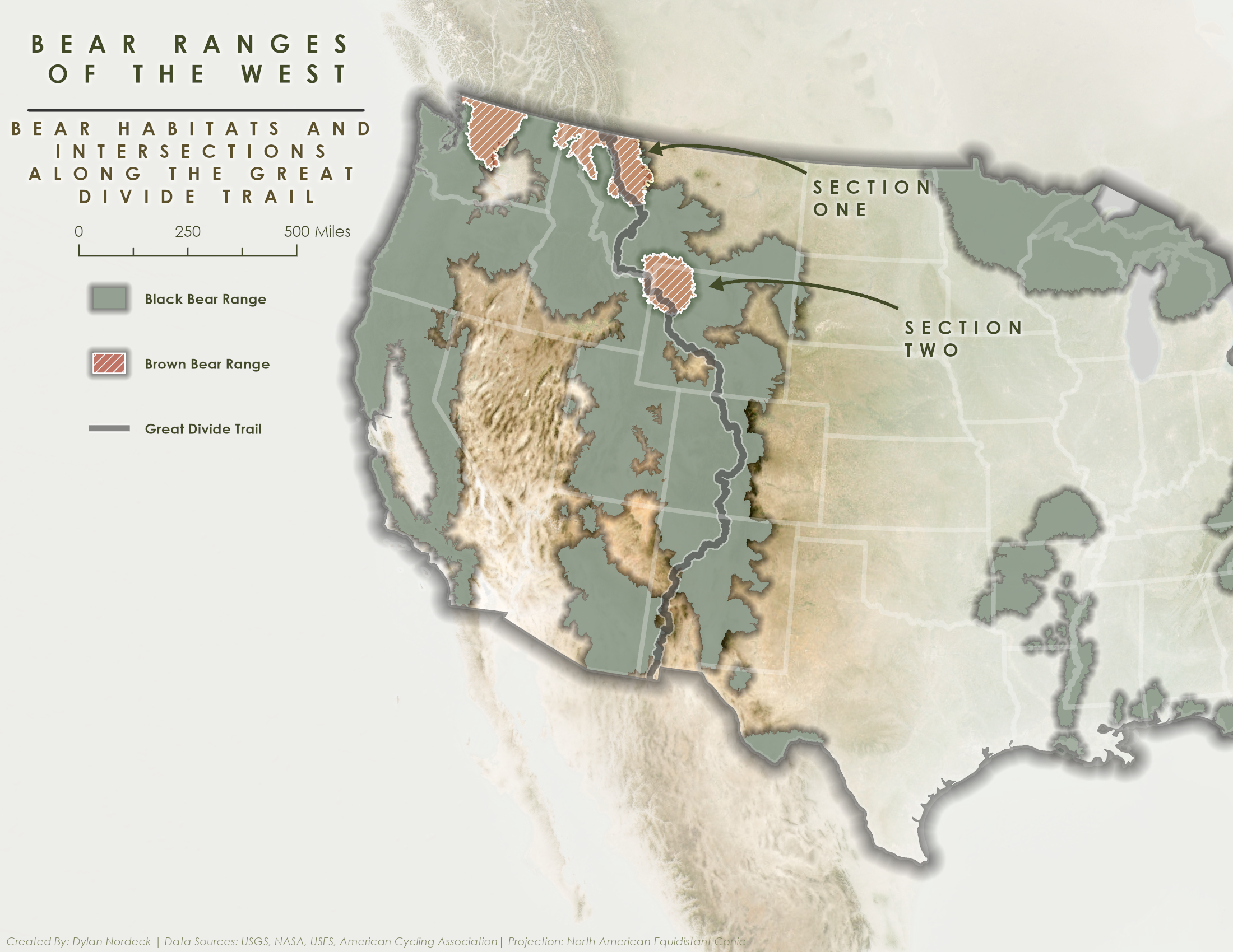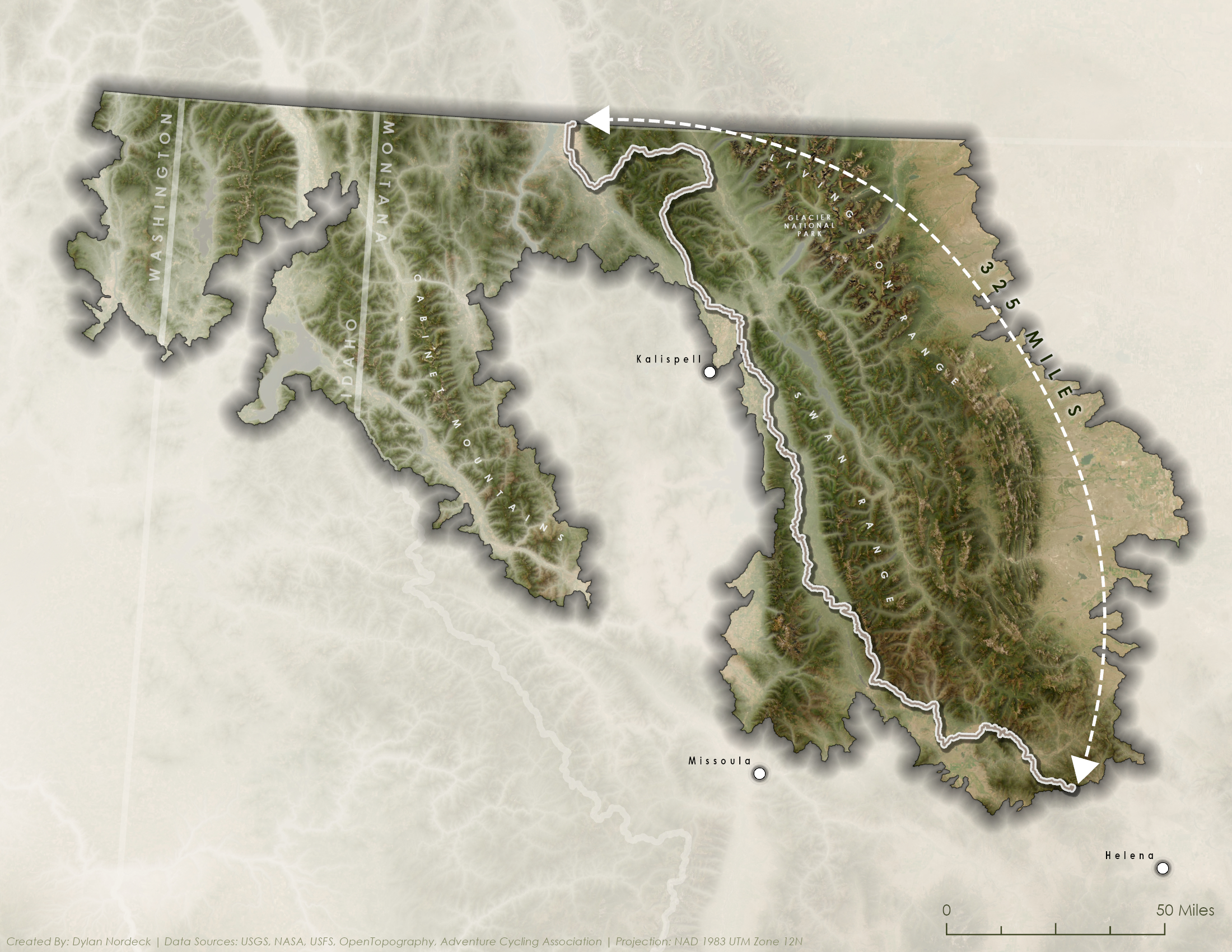 A cartographic exploration of the Great Divide Trail through western Montana, highlighting the Grizzly Ranges and surrounding topography. The map uses terrain shading, restrained color, and careful typographic hierarchy to guide the viewer along the route while preserving a calm, print-inspired aesthetic.