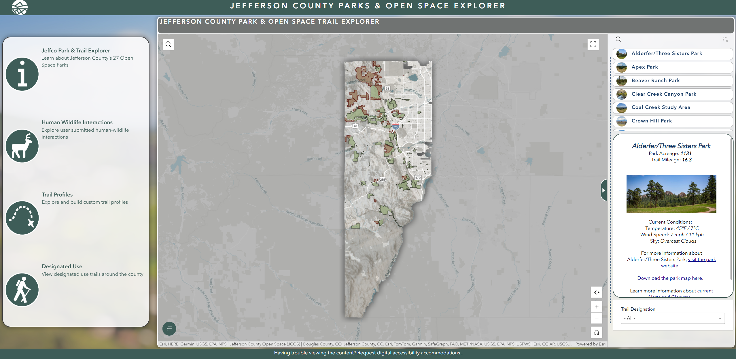 The Jefferson County Parks & Open Space Explorer is a public-facing web application designed to replace a collection of legacy dashboards and static maps with a single, accessible, and expandable platform.